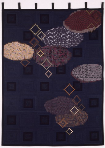 DescriptionTitle: Autumn Radiant Year Completed: 2003 Size: H82.5” × W62” / H210 cm × W158cm Material: old Japanese cotton, modern cotton Statement: Having acquired a large amount of old Japanese blue fabrics (not aizome) for background, I superimposed a design simulating thickness. For accent I added squares made of small points of modern fabric. |