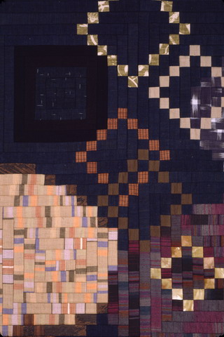 DescriptionTitle: Autumn Radiant (Detail) Year Completed: 2003 Size: H82.5” × W62” / H210 cm × W158cm Material: old Japanese cotton, modern cotton Statement: Having acquired a large amount of old Japanese blue fabrics (not aizome) for background, I superimposed a design simulating thickness. For accent I added squares made of small points of modern fabric. |