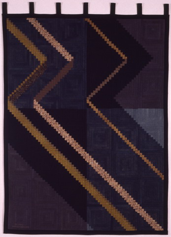 DescriptionTitle: Autumn Visits Us Year Completed: 1992 Size: H75” × W56.5” / H190 cm × W143 cm Material: old cotton (aizome), new cotton (Japan), old silk (obi), synthetic blends Statement: The design is kept simple by intention. The zig-zag shapes suggest a view within a large temple compound, where one can see diagonally the point to which one's path leads, but can only reach that point by walking on a series of platforms all at right angles to one another. (Collection of the National Quilt Museum, Paducah, KY) |