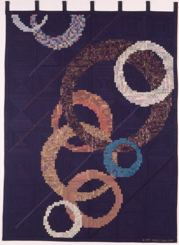 DescriptionTitle: Comfortable Echoes Year Completed: 1997 Size: H82.5” × W62” / H210 cm × W158 cm Material: old silk (kimono lining), new cotton (hand-dyed, include marbled, America, Indonesia), new cotton (Japan, America, France), blend Statement: I had realized that one could use the straight lines and right angles of the Log Cabin technique to create circular shapes of different sizes. Different choices of continuing colors at intersections create a feeling of depth. |