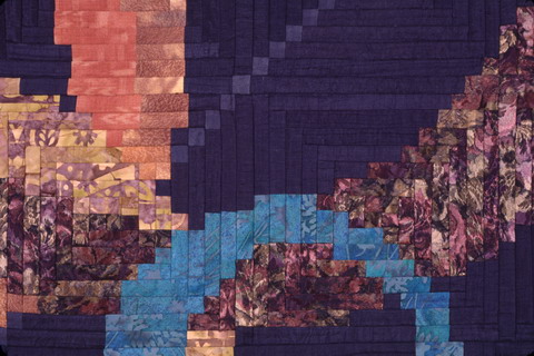 DescriptionTitle: Comfortable Echoes (Detail) Year Completed: 1997 Size: H82.5” × W62” / H210 cm × W158 cm Material: old silk (kimono lining), new cotton (hand-dyed, include marbled, America, Indonesia), new cotton (Japan, America, France), blend Statement: I had realized that one could use the straight lines and right angles of the Log Cabin technique to create circular shapes of different sizes. Different choices of continuing colors at intersections create a feeling of depth. |