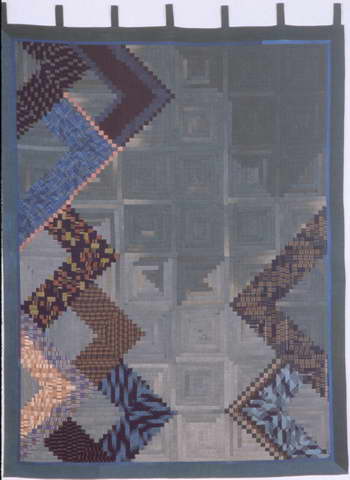 DescriptionTitle: Good to See You Again Year Completed: 1988 Size: H75.5” × W58” / H192 cm × W147 cm Material: old cotton (aizome, kusakizome, kimono), new cotton (furoshiki, my own hand-dyed) Statement: For several years I had been accumulating traditional fabric at the two monthly flea markets in Kyoto (at Tohji and at Kitano Tenmanguu). The title "Good to See You Again" refers to bringing these fabrics together in a single quilt. The design comes from adding leftover liquid detergent to a new bottle with a slightly different color and density. As the older liquid gradually penetrates the new, the color patterns shift. The title comes from having accumulated old Japanese fabrics and bringing them to New York, and finally finding a way to bring them together in a single design. |