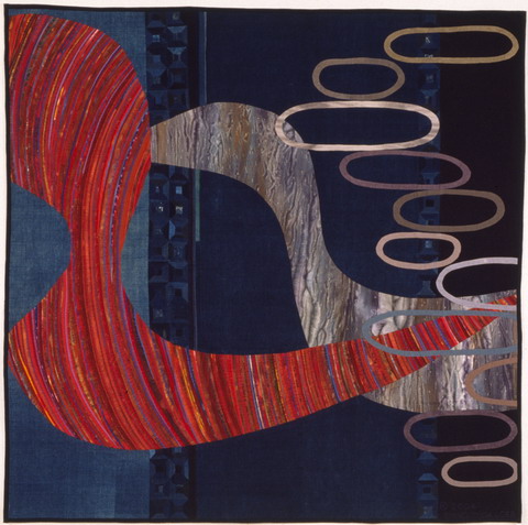 DescriptionTitle: Heavenly Brilliance Year Completed: 2004 Size: H56.5” × W57” / H143 cm × W145 cm Material: old cotton, new cotton (including American hand-painted) Statement: This ("Heavenly") series gave me an opportunity to strengthen three of my weaknesses: squares, small sizes, applique. I hoped to become more proficient and natural in the use of these. Curves were the theme for this quilt. The red part has a three dimensional aspect, with gentle and very narrow curves for which I used a great deal of fabric and thread. |