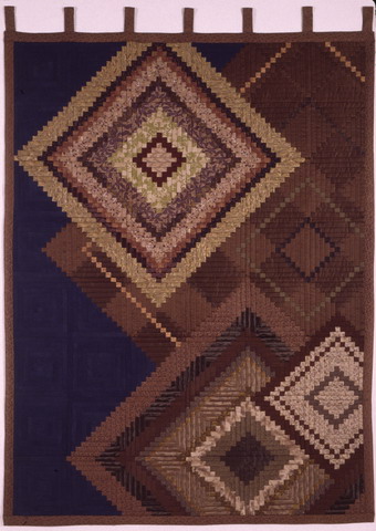 DescriptionTitle: Joyful Premonitions Year Completed: 1993 Size: H75” × W56.5” / H190 cm × W143 cm Material: old cotton (aizome), new cotton, old silk (obi, kimono, raincoat), new silk (necktie) Statement: This suggests a collection of attractive old and new square-shaped buildings (for example Manhattan, Europe, Japanese minka). I wanted to use a variety of browns for the buildings against a blue background to see how effectively these colors could be combined. |
