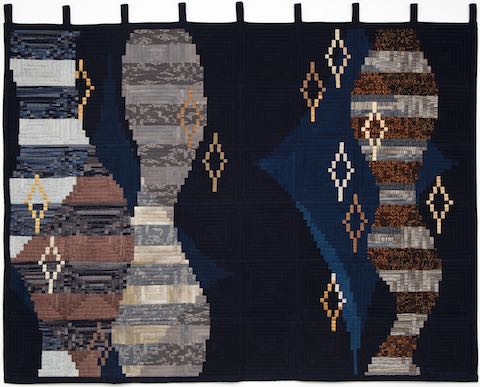 DescriptionTitle: Kamuri = Beautiful Dreams from Villages Year Completed: 2016 Size: H66” × W82” / H165 cm × W205 cm Material: Japanese antique cotton, new silk (including Southeast Asian scarves), new hand-dyed cotton Statement: Some years ago we were in a rural European village where I saw a flower box with unusual yellow flowers with slightly curved diamond shapes which I found fascinating. I wondered what kinds of shapes these flowers might have in a wind. Later when we visited some charming villages in Southeast Asia, they suggested soothing and leisurely dreams. |