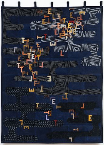 DescriptionTitle: Misty Heart Year Completed: 2012 Size: H82.5” × W62” / H210 cm × W158 cm Material: old Japanese cotton (aizome, including kasuri), modern silk (including Cambodian) and cotton Statement: I used the kasumi pattern but without overlapping. I inserted my initials ETL throughout with the intention that they would carry away all of my accumulated troubles. |