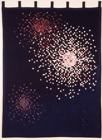DescriptionTitle: My Hometown Year Completed: 1994 Size: H76.5” × W59” / H194 cm × W150.5 cm Material: old cotton (aizome), new cotton (Japan, America, France), corduroy, silk (necktie) Statement: Although I live in New York, I always return to Japan for the summer, arriving in June, just in time for the gloomy rainy season. Yet I am always refreshed by seeing bright hydrangeas blooming everywhere. From distance we see only pink or blue, but approaching closely reveals a beautiful variety of shades. I realized we also see this in fireworks or in chandeliers, even in light passing through frosted glass. If you look closely at the lower right, you can see a bit of fireworks. |