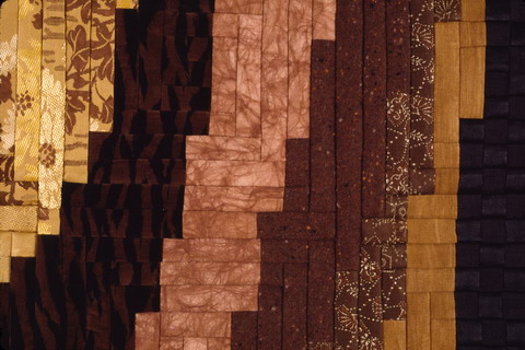 DescriptionTitle: My Hometown (Detail) Year Completed: 1994 Size: H76.5” × W59” / H194 cm × W150.5 cm Material: old silk (kimono, obi), wool, old cotton (noren, happi), new cotton (Japan, America), polyester Statement: In a world dominated increasingly by new metallic machines (computers, cell phones, etc.) I still retain a love for wood objects (floor, ceiling, columns, furniture) with a special soft spot for grain patterns. For background I used a silk kimono which my grandmother wove as a young woman, along with various-textured black fabrics. Using many different fabrics I created wood patterns set against this background. |