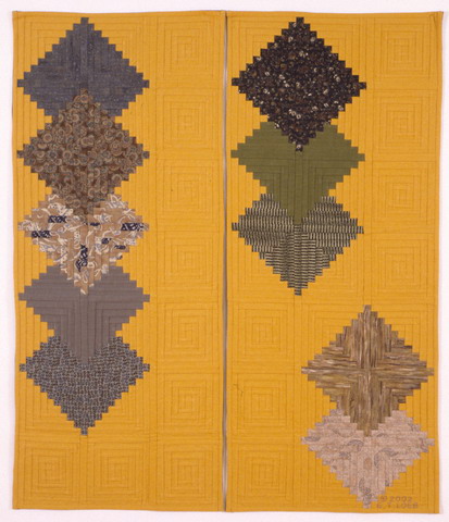 DescriptionTitle: Noren Year Completed: 2002 Size: H45” × W19.5” / H114 cm × W49.5 cm Material: new cotton Statement: At my mother's request I made a noren (a kind of thin curtain often hung between rooms in Japanese homes to afford at least some privacy) to hang between the entrance room and the kitchen. Therefore there is no batting between the two sides even though this is a reversible quilt. I purposely kept the design rather simple, in order to harmonize with the furniture in those rooms. However after completing the quilt I decided not to use it as a noren after all. |