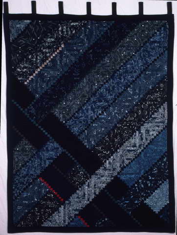 DescriptionTitle: Old Capital Year Completed: 1986 Size: H73.5” × W57” / H187 cm × W144.5 cm Material: old cotton (aizome, kasuri), new American red cotton Statement: After finishing BOHKYOH, which at the time I had thought was the most difficult project possible, I stopped thinking about reversible quilts for a while. However about a year later my interest reawakened. I had in the meantime accumulated more aizome, and from a friend had received some obi scraps which were beautiful, but extremely hard to quilt. For that reason I began to think about a second reversible long cabin quilt. I was not yet able to calculate exactly how much fabric I would need for a reversible quilt, so I limited my choices to fabrics which I had in abundance. The design symbolized the former ordinary folk, with a subdued atmosphere, but certainly solid, expressed in cotton, including fabrics faded through long use. These workaday fabrics were used by the common people for countless purposes including clothing, bedding, and cushions. The "over and under" part of the design probably was inspired by woven baskets. |