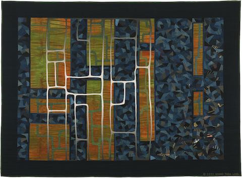DescriptionTitle: The Princess of Weaving VIII Year Completed: 2021 Size: H55” × W75” / H138 cm × W188.5 cm Material: Old cotton (aizome and kusakizome), cotton satin (including hand-dyed) Techniques: Machine piecing, hand aplique, and hand quilting Statement: Against a background of angular scraps of aizome I wanted a soft, gentle, and fragile feeling, which a lattice of narrow appique strips provided. A sense of depth which is created by the strips so that the cotton satin and kusakizome seem more distant, and the background aizome further still. |