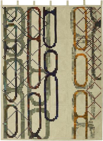 DescriptionTitle: The Promise Year Completed: 2013 Size: H82.5” × W62” / H210 cm × W158 cm Material: Thai silk (including scarves), hand-dyed cotton, hand-dyed cotton satin Statement: This side also based on the double wedding ring pattern. It appears to have three layers: in front the rings are converted into squares of different sizes, and behind them are two layers of ovals suggesting the openings found in droplets of spilt milk, all superimposed on a gray background. |