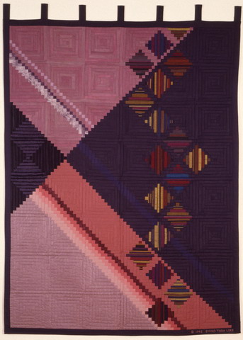 DescriptionTitle: Promise of Spring Year Completed: 1992 Size: H75” × W56.5” / H190 cm × W143 cm Material: old cotton, new cotton (hand-woven Indian, hand-dyed Japanese and American, commercial), old silk (obi), Swiss blend, unidentifiable Statement: Another image of Spring in Japan, with cherry trees in full bloom on a mountainside, with a gentle rain which causes the blossoms to drift gracefully down to the ground. |