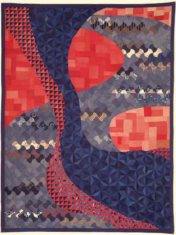DescriptionTitle: Secret Fire Year Completed: 1987 Size: H90” × W67.5” / H228 cm × W172 cm Material: old cotton (aizome, kusakizome, akanezome, sarasa), new cotton (Japan) The akanezome fabric used in this quilt has faded considerably over the years (Please see the note for the preceding quilt, Oral Tradition) Statement: With this quilt I departed from the tradition of using single established pattern blocks, replicated as many times as the design required. Although this quilt and later ones do use traditional patterns, I never again used them in a straightforward traditional manner. Most of this quilt was machine-pieced, but I found it easier to do the gray area by hand (probably not true now). The patterns I used all exist traditionally in both Japan and the U.S. |