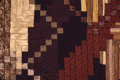 DescriptionTitle: Soaring Dreams (Detail) Year Completed: 1999 Size: H82.5” × W62” / H210 cm × W158 cm Material: all silk (obi, haori, kimono raincoat) Statement: As a person born and raised in Kyoto I have naturally lived within its older, graceful, and artistically sensitive nature. As a person whose work has often brought me to Edo (now Tokyo) I have often come up against its more modern, outward, and sharply contrasting senses. This quilt expresses my hope that I can live in both these worlds without compromising myself. This represents my image of Kyoto Against a background of black haori I chose a variety of obi, using a most unusual and bright reflecting obi as the main focus of the design, adding more subdued obi for related shapes. An important accentuation comes from a series of squares comprising tiny squares. At first one hardly notice them, but they have an important function in the design. |