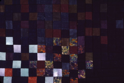 DescriptionTitle: Song For a Friend Year Completed: 1999 Size: H36” × W45.5” / H92 cm × W115 cm Material: old cotton (aizome), new cotton (hand-dyed, commercial), old silk (obi) Statement: This quit is smaller than my usual reversible quilts, which might suggest that it was easier to make, but in actuality it was much harder as the design possibilities were much more limited. I had gone to a fireworks display with some friends, which can explain the image, but people who are fond of flowers can also see these shapes as flowers. (Private collection) |