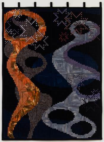 DescriptionTitle: Star Hunter Year Completed: 2013 Size: H82.5” × W62” / H210 cm × W158 cm Material: antique Japanese cotton (aizome), new cotton (including hand-dyed and Balinese batik) Statement: On a background which suggests clouds in motion I placed stars outlined by patterns of dots, some brighter than others as we see in the nighttime sky. It was very difficult to calculate the amount of fabric which I would need for the cloud shapes. As my supply dwindled, I made the clouds smaller. |