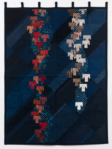 DescriptionTitle: T-Carnival Year Completed: 2010 Size: H82.5” × W62” / H210 cm × W158 cm Material: old Japanese cotton, new cotton (including hand-dyed, hand-painted) Statement: I had many left-overs of solid antique Japanese cotton fabrics which I used as background. I used red, gray, and brown to suggest falling "T" shapes. I used cotton satin in checkerboard patterns to suggest an intermediate depth between the "T" shapes and the background. |