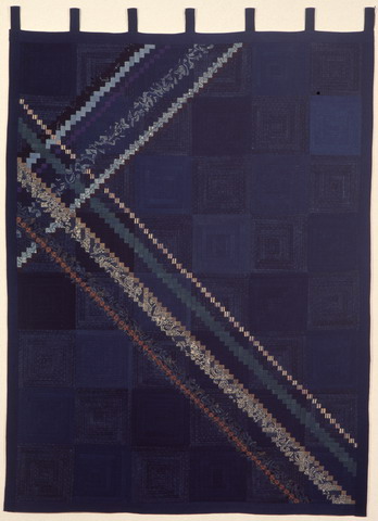 DescriptionTitle: Thinking About the Past Year Completed: 1988 Size: H76” × W56.5” / H193 cm × W144 cm Material: old cotton (aizome, kusakisome, sarasa, noren) Statement: By this time I had become able to use narrow strips made from many small pieces arrayed diagonally to create delicate feelings. The design came quite naturally from particular viewpoints of some attractive places inside of my favorite temples. In Japan we often see a small cottage or garden through a bamboo fence or screen; the image often is more attractive than what we would see without the bamboo. The background suggests a kind of screen with gold or silver colored paper squares, realized with several different shades of dark blue (aizome). |