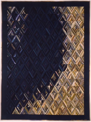 DescriptionTitle: Winds Welcoming Spring Year Completed: 1996 Size: H95” × W71” / H241 cm × W180 cm Material: old cotton (aizome), new cotton (more than 100 kinds) Statement: This quilt uses an unusual variant of the Seminole technique, requiring two different basic triangles instead of the customary one. The different areas of color suggest the Winter winds eventually being transformed into the Spring winds. |