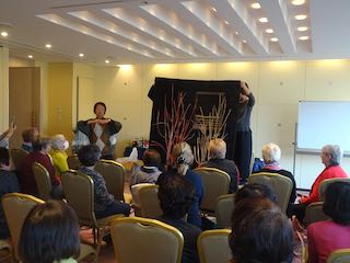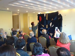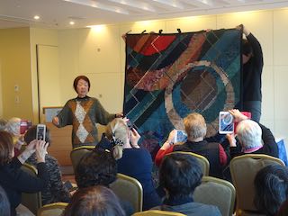 久しぶりに オーストラリアからのキルター達と再会。いつものように ホテルの会議室で ショウ&テルをやりました。私は、リバーシブルキルト「円」の説明です。