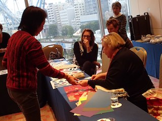 たった2時間で、しかもミシンなしでのワークショップ。初めての試みでしたが、布と色紙を使って。