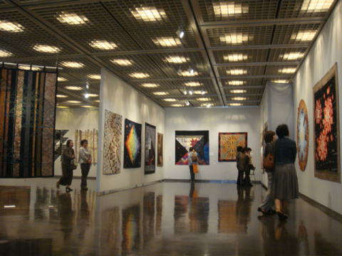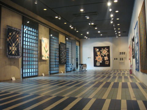 5階 展示ギャラリー正方形を対角線に切ってできる直角二等辺三角形を一個以上入れればいいという漠然とした条件の中、これほど異なったキルトが80枚できあがりました。