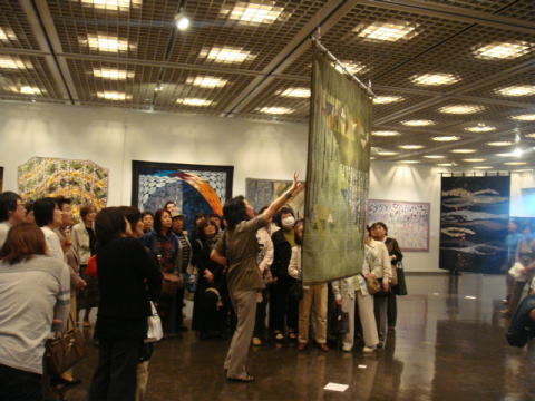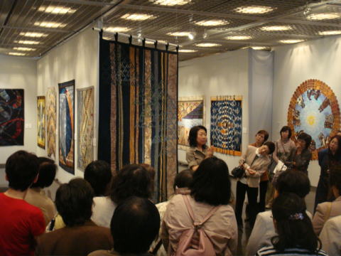 ギャラリートーク その1。リバーシブルで直角二等辺三角形をデザインしたキルトについて説明。