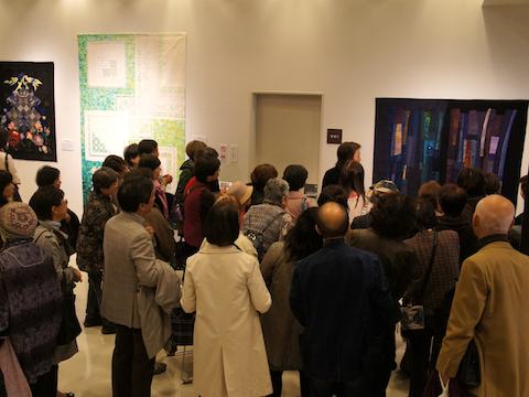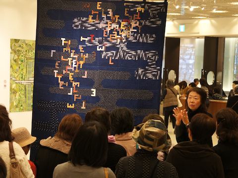 どこに「イニシャル」が入っているか、京都にきてくださった方々と同じように、皆さん興味津々。私の作品としては珍しくビーズや刺繍をたっぷり入れて、ミシンキルティングと刺し子を両立させたことなど、説明しています。 |