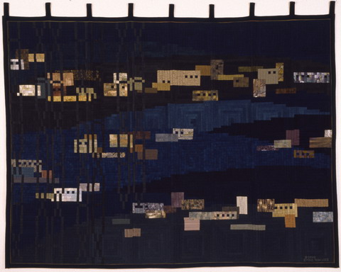 コメント : 砂漠の中に点在する家です。窓は小さく、家は色々な大きさと形の立方体。昼間の灼熱の時が終わり、厳しさがやわらぐ夕刻、これもイスラムの模様を通して、見慣れない風景からデザインしました。