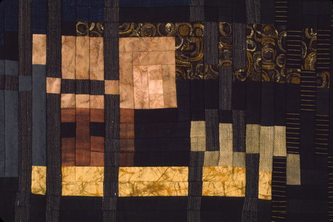 コメント : 砂漠の中に点在する家です。窓は小さく、家は色々な大きさと形の立方体。昼間の灼熱の時が終わり、厳しさがやわらぐ夕刻、これもイスラムの模様を通して、見慣れない風景からデザインしました。