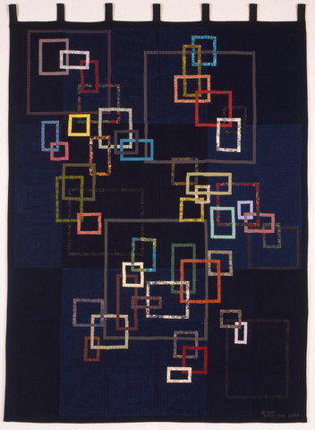 コメント : 藍の濃淡を土台に、私としては思いっきりカラフルな色を使って、大小の四角で遊びました。ブロックにまたがって一つの四角を作るのは、なかなか難しい。でも大好きな布達といっしょに彩遊びを謳歌!