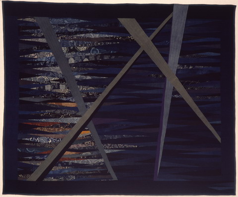 コメント : 永遠に変わらない偉大なものへの、畏敬の念をこめて・・・ 例えば海、埋め立てたり、橋をかけたりは出来ても、そこに海があること自体は同じです。例えば山脈、削り取って家を建てたり、土を取ったり。でもどこまでも続く山脈には変わりありません。何千年前からずっと。そして何千年後の未来までも・・・。 「未醒」で三つ半の星を一枚のキルトに入れ込むアイデアを実行した頃から、同じパターンを並べることから卒業していったようです。 キルティングのデザインは、あちこちの枯山水の庭や、木肌の美しい木目からきています。