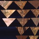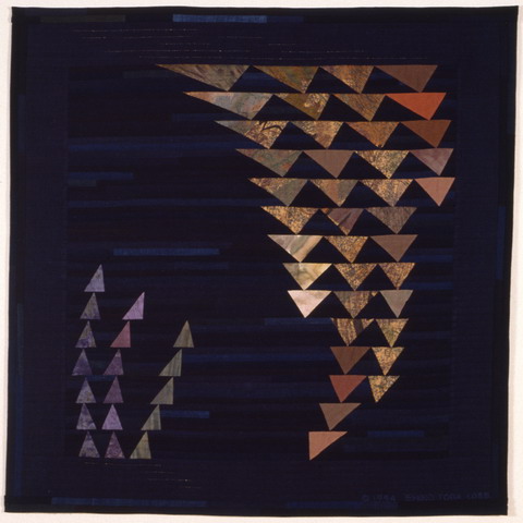 金木犀(きんもくせい)制作 : 1994年 タイプ : ノン・リバーシブル 大きさ : 縦 91cm 横 91cm 素材 : 古布木綿(藍染)現代手染め木綿 現代手描き木綿 現代木綿 家具用布 コメント : 私の所属するマンハッタン・キルターズ・ギルド メンバー全員(当時25名)で同じサイズで俳句をテーマに取り組んだ作品。1ヤード(91cm)四方の正方形という制約のもと(5・7・5の制約のかわり)"金木犀 ほのかに香る 宵の庭" の俳句より木の葉が垂れているような三角形も全部直線ですが、曲線のフィーリングです。 |