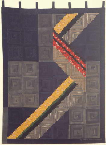 コメント : 京都の蚤の市で買い集めた布達が、何年か後に一枚のキルトの中で再会しました。すっかりリバーシブルキルトが面白くなった頃で、扱いが難しい喪服の帯や、裂織の帯なども使ってみました。少し入れた赤がアクセントになって、華やいだ女心が表現できていればいいのですが・・・・