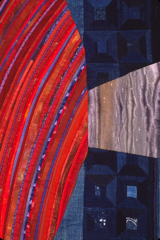 コメント : 当時苦手だった3つの要素(正方形、小サイズ、アップリケ)を克服したくて、チャレンジしたシリーズです。カーヴをテーマに。赤い部分は3Dになっています。やわらかい曲線を出すのが面白く、布と糸を沢山使いました。
