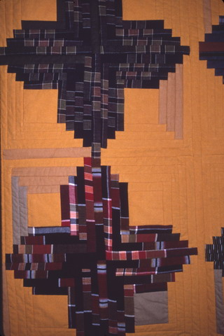 コメント : アメリカで出版された「ログキャビン」という本の中で両面同じデザインで色違いのリバーシブルキルトを発見してから両面デザインの異なるリバーシブルを同時に縫うのは不可能なのかしら?という考えに達し、3年間の試行錯誤の末、やっと完成した私のリバーシブル第一号です。ずいぶんシンプルなデザインですが 当時の私にはこれ以上難しいログキャビンはないと思えるくらいでした。