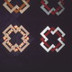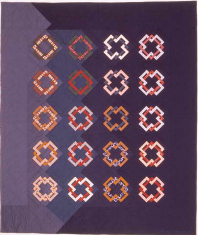 コメント : まずこれは日本の紋「結び角」からアイデアがきました。それをパッチワークのパターンに画き直し、ピーシング可能なブロックに製図しました。今だったら、全くなんでもないこんな作業も当時の私には大事業で、製図して、実際に型紙をとり、その通りに縫ってみて、もっといい方法や切る必要のないところなどを発見。今考えると、やはりそういった積み重ねがあるのですね。