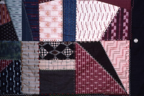 コメント : この作品を仕上げる3年前の夏、松本に旅行した時、ちょっとしたきっかけから手に入れた信州紬を中心に創った初めてのクレージーキルト。ほんの少しづつしかなかった上、それぞれが個性的な布で、クレージーキルトの難しさを思い知らされたキルトです。周囲の4辺、全部幅が違います。これも、当時はかなりのチャレンジでした。祖母は結婚前に自分で織ったという黒い紬で紋付だったのを、一つだけ右下にいれました。
