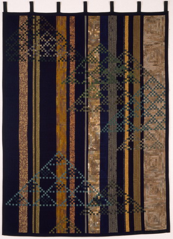 コメント : 藍染と茶系の布で縦縞を作り、その中に緑系で大小の三角をおいてみました。大好きな京都嵯峨野の竹薮の印象が出ていれば成功です。