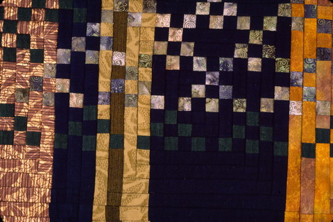 コメント : 藍染と茶系の布で縦縞を作り、その中に緑系で大小の三角をおいてみました。大好きな京都嵯峨野の竹薮の印象が出ていれば成功です。