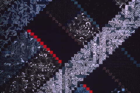 コメント : 「望郷」制作後しばらくはリバーシブルを考える余裕がありませんでした。一年くらいして頭の中に 少し余裕ができ、だんだん増えてきた藍染や、頂いた帯の端切れも取り入れて第二作目に挑戦する気になりました。 藍面は主に庶民の布団地や仕事着で、黒面は上流階級のイメージです。結果「古都」と命名。