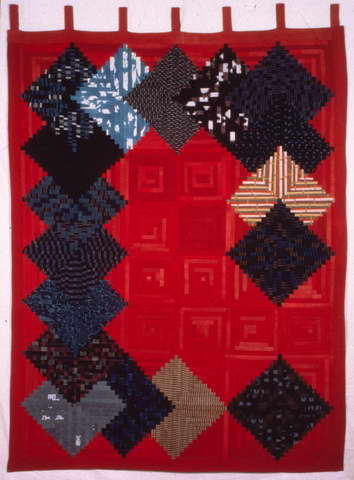 コメント : 藍染の無地も大分たまり、無地の深さ、素晴らしさが大分わかって来た頃です。私といっしょに海を渡って来てくれた藍染の布達と、来る日も来る日も話をしていました。女性用着物の裏用として染め、織られた布が約7着分たまったので、土台に使うことにしました。同じ一枚の裏からきていても、たもとだった所とえりだった所ではあせかたが違っています。文字通り当時の女性の汗とともに働いた布です。 IQM国際キルト博物館(ネブラスカ州 リンカーン)所蔵