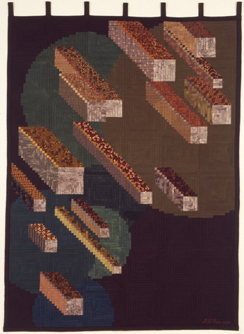 コメント : 土台に大好きな草木染で円を飛ばし、その上に大小の立方体(箱)を同方向においてみました。これも好きなインドネシアバティックと、日本の縞を使い、初めて羽裏も使っています。男物の羽織の裏の面白さ、素晴らしさを再認識です。