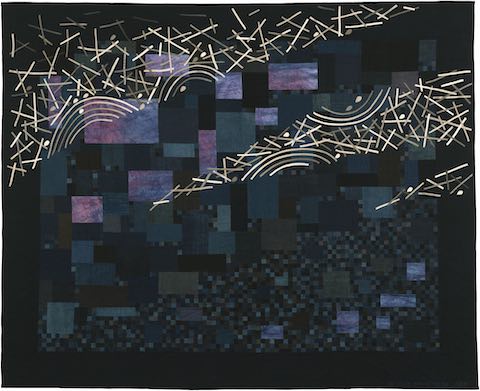 織姫 VII(おりひめ7)制作 : 2020年 タイプ : ノン・リバーシブル 大きさ : 縦 137cm 横 168.5cm 素材 : 古布木綿(藍染)、綿サテン(手染めを含む)、現代木綿 手法 : ミシンピーシング、ハンドアップリケ、ハンドキルティング(刺し子糸使用) コメント : これも 竹かごのやたら編からアイデアがきました。 |