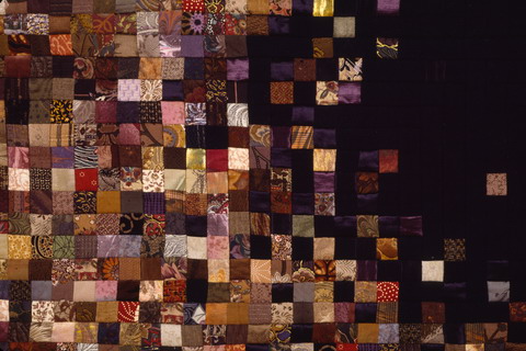 コメント : 15年間日本の春から遠ざかり、遠い記憶の中にある、日本の艶やかな春爛漫の風情をもう一度見たいと思いながら、デザインしました。上空から眺めた日本の春の印象です。土台になる濃い藍染と色にあたる部分の2色使いで、色の部分には明治時代の袋帯、祖母の大島紬、友人が染めたマーブル染め、インドネシア更紗のシャツなど、約120種の布がはいっています。