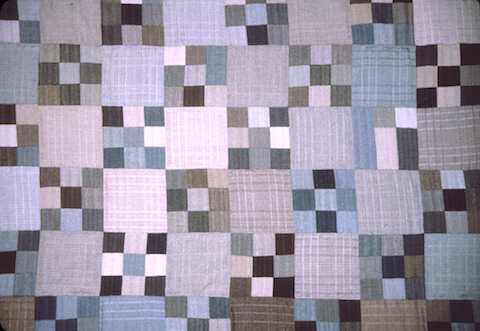コメント : [Sourdine]と同じ布見本を使いました。1枚が小さかったのでデザインの可能性が少なく、今度はダブルナインパッチを基本に、くずしていきました。 IQM国際キルト博物館(ネブラスカ州 リンカーン)所蔵