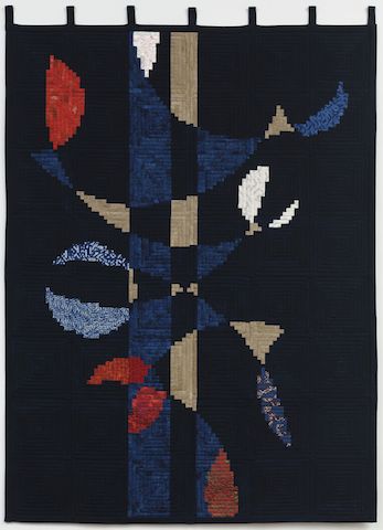 コメント : できるだけ色数をおさえ、シンプルに。中央の縦直線以外は、すべてコンパスの円の一部を組み合わせてデザインしています。土台(地)に使った古布木綿(藍染)の深みに助けられました