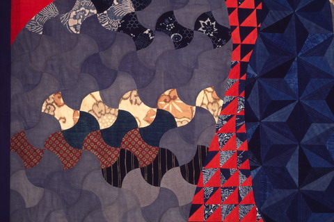 コメント : まず、絵を描くように全体にフリーハンドで大胆に線を引き、藍染でピーシングした麻の葉文様を中心に、分銅,四角、三角を入れました。このころから、自分のスタイルがはっきりしてきたようです。