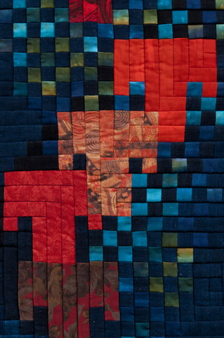 コメント : 今まで使ってきた大量の古布藍染の無地、その残りを集めて、バックグラウンドにし、赤を中心にグレー、茶系でTを降らせました。大好きな手染めのコットンサテンを小さく切って市松にセットして、バックグラウンドとTの間にはさみ、奥行きを出しました。